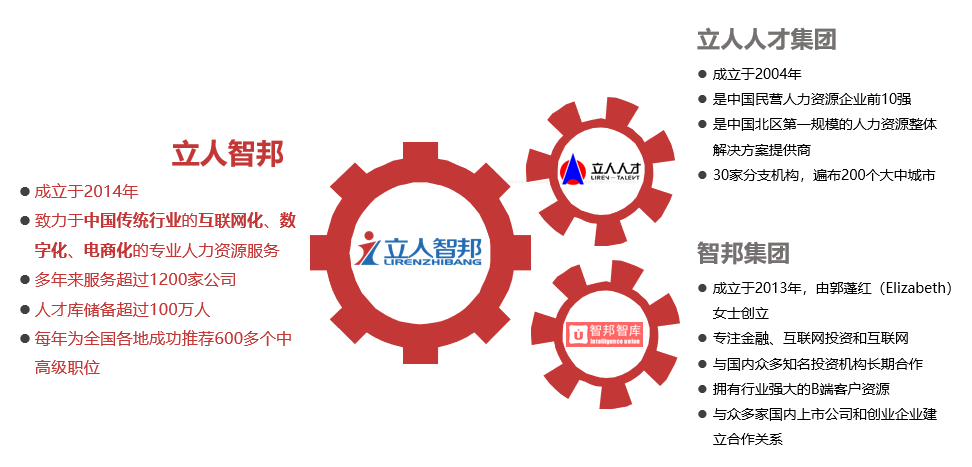 立人智邦成立于2014年,是由立人人才集團(tuán)與智邦人力集團(tuán)強(qiáng)強(qiáng)聯(lián)手共同組建,這兩家公司在業(yè)內(nèi)都具有十余年獵頭經(jīng)驗(yàn)的著名獵頭公司。立人人才集團(tuán)成立于2004年,是中國民營(yíng)人力資源企業(yè)前10強(qiáng),也是中國北區(qū)第一規(guī)模的人力資源整體解決方案提供商。立人人才集團(tuán)擁有30家分支機(jī)構(gòu),遍布200個(gè)大中城市。立人人才集團(tuán)組織架構(gòu)為事業(yè)部制,外包事業(yè)部、獵頭事業(yè)部(立人智邦)、管理咨詢事業(yè)部、互聯(lián)網(wǎng)+事業(yè)部。智邦集團(tuán)成立于2013年,由郭蓬紅(Elizabeth)女士創(chuàng)立,在創(chuàng)業(yè)初期以專注互聯(lián)網(wǎng)投資和互聯(lián)網(wǎng)被投企業(yè)提供人才服務(wù)為主線,同時(shí) 探索二三級(jí)城市傳統(tǒng)行業(yè)為輔線。智邦集團(tuán)與國內(nèi)眾多知名投資機(jī)構(gòu)長(zhǎng)期合作,擁有行業(yè)強(qiáng)大的B端客戶資源。目前已與眾多家國內(nèi)上市公司和創(chuàng)業(yè) 企業(yè)建立合作關(guān)系,并成就了優(yōu)秀人才的職業(yè)發(fā)展。